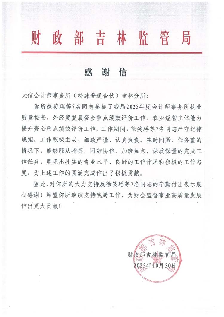 财政部吉林监管局在感谢信中表示,大信委派的业务骨干徐笑瑶等7名同志,在2025年度会计师事务所执业质量检查、外经贸发展资金重点绩效评价工作、农业经营主体能力提升资金重点绩效评价工作期间,严守纪律规矩,工作积极主动、细致严谨、认真负责。展现出扎实的专业水平、良好的工作作风和积极的工作态度。鉴此,对大信的大力支持及徐笑瑶等7名同志的辛勤付出表示衷心感谢!