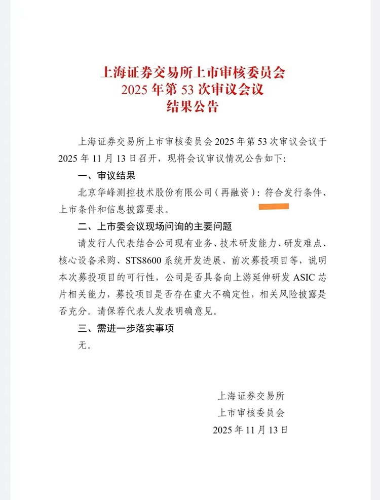 11月13日,大信助力客户北京华峰测控技术股份有限公司向不特定对象发行可转换公司债券申请,获得上海证券交易所上市审核委员会审核通过。