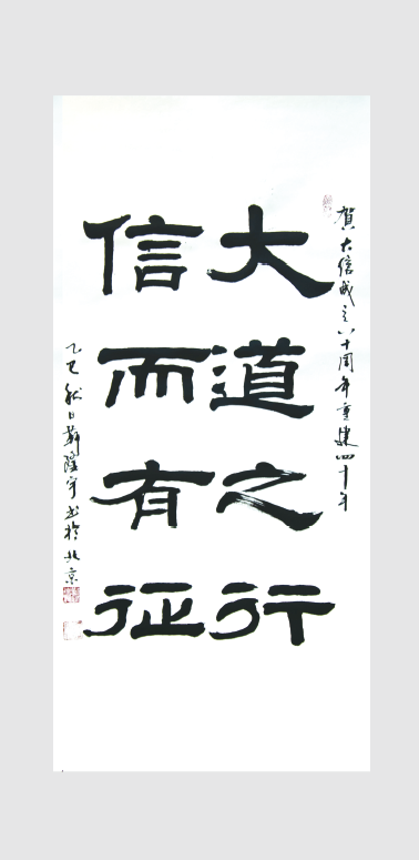 “大道之行”出自西汉戴圣编纂的儒家典籍《礼记·礼运》核心篇章,“大道之行也,天下为公,选贤与能,讲信修睦”,意思为太平盛世的时代,天下是人们所共有。把品德高尚的人、有才干的人选拔出来(治理天下),人们之间讲究信用,培养和睦(气氛);“信而有征”出自《左传·昭公八年》“君子之言,信而有征,故怨远于其身”,意为言论或事实可靠且有据可查,本作品“大道之行,信而有征”,集字而成,两句的首字组成大信会计师事务所的“大信”二字,“信而有征”特别契合会计师行业的特点,以示我们的审计报告均可信而有据可查。这八个字结合起来可理解为:真正的真理与正道,在其运行实践中,必然是真实可信的,并且会通过确凿的迹象和效果显现出来。