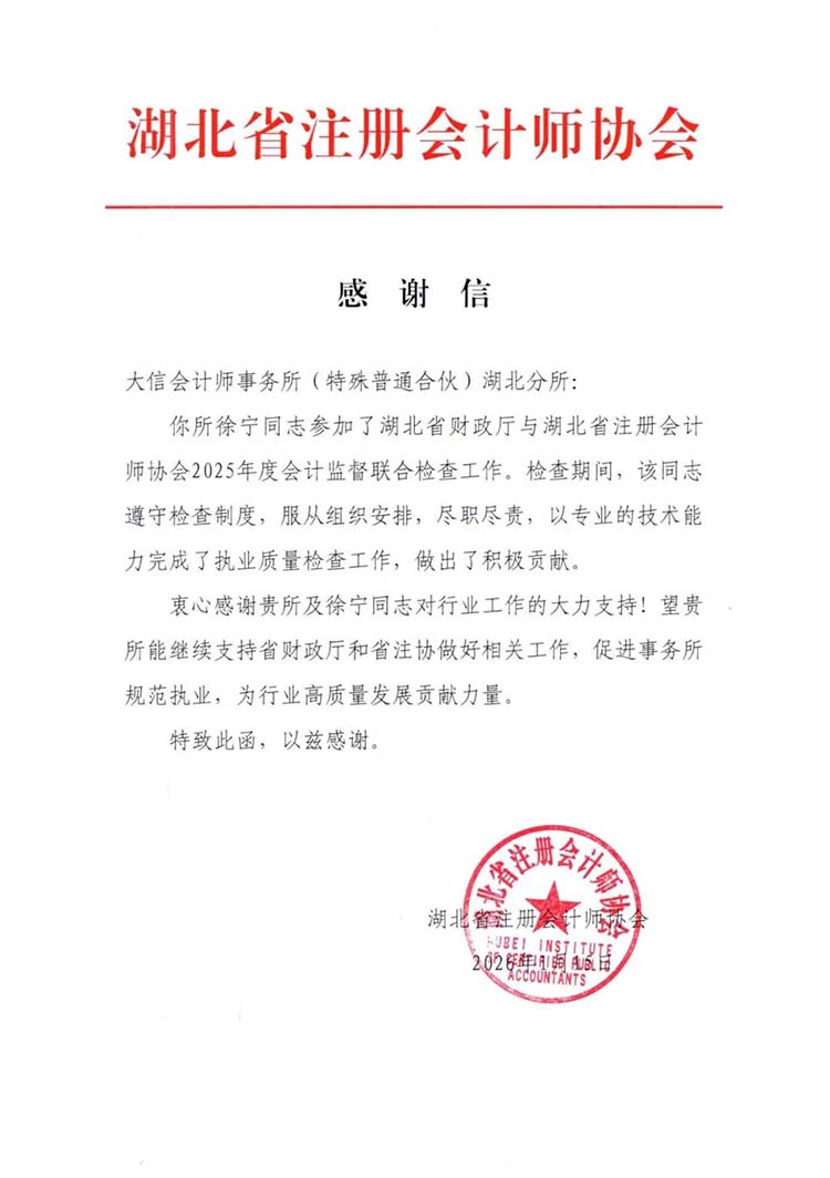 近日,大信收到两封来自湖北省注册会计师协会的感谢信,对我所湖北业务总部徐宁、张体梅、杨鹏同志在参与湖北省执业质量检查工作中做出的积极贡献表示衷心感谢。