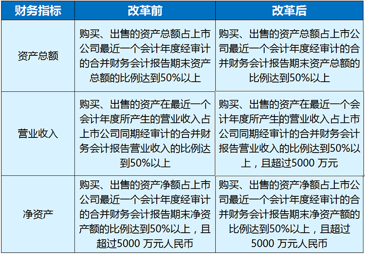 创业板改革后,《持续监管办法》对《重组办法》认定标准中的营业收入指标增加“营业收入不超过5000万”额外要求,较主板和中小板条件放宽,与科创板标准一致。